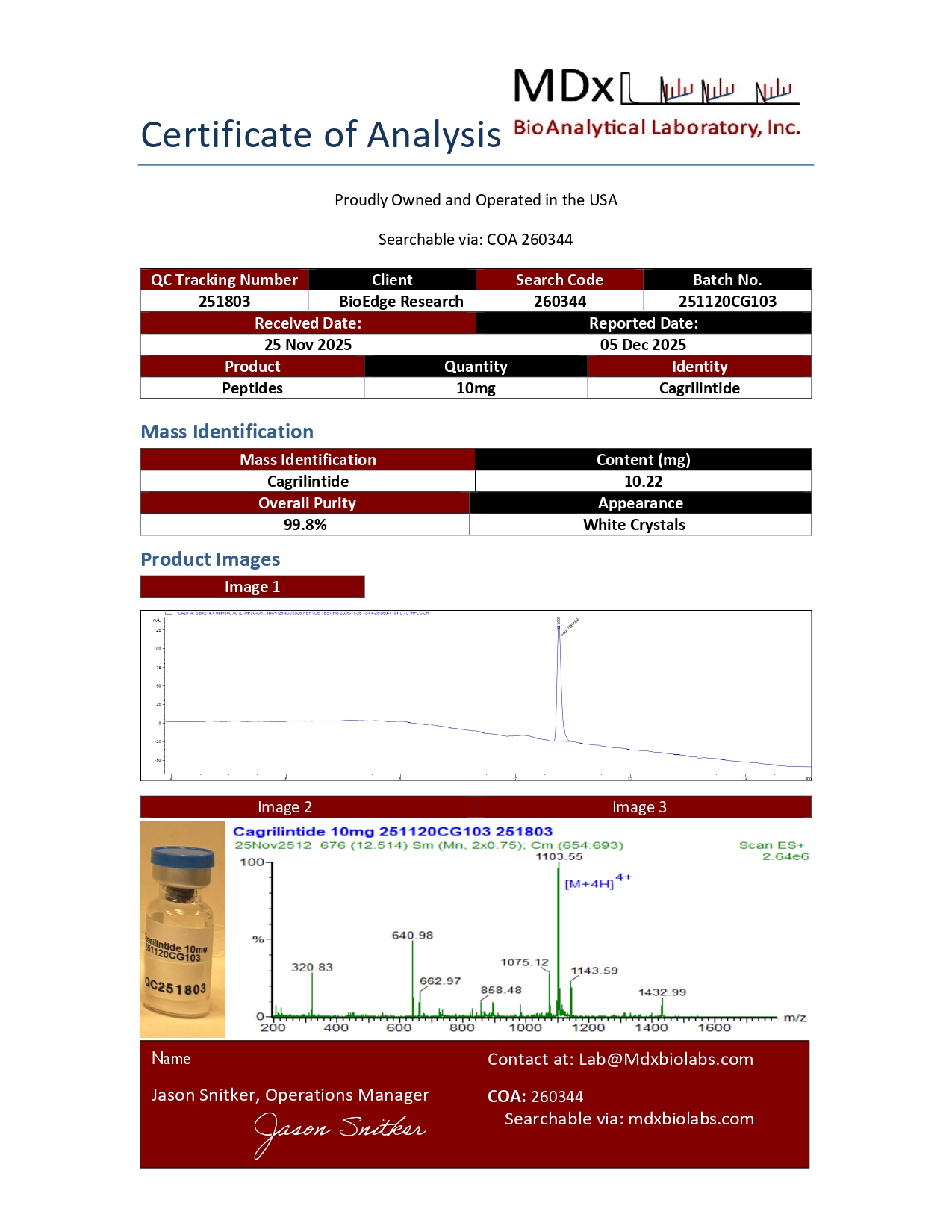 Batch-specific COA from an independent lab. Not a generic PDF recycled across products. Every vial of Cagrilintide is backed by independent third-party laboratory testing, with a Certificate of Analysis available for review on our product page.. HPLC confirms purity. Mass spectrometry confirms molecular identity. The COA corresponds to the specific batch you receive.