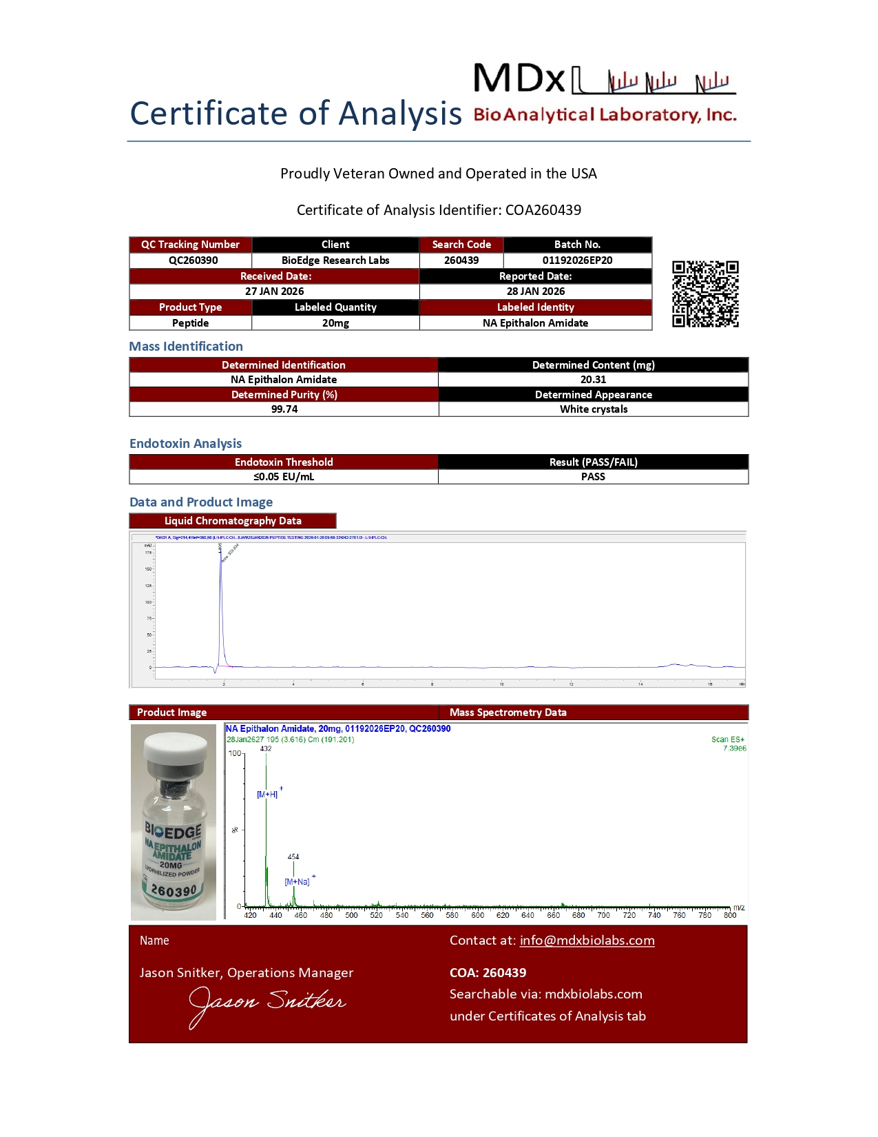 Every batch of BioEdge NA Epithalon Amidate undergoes independent third-party testing prior to release. Testing is performed by ISO-accredited laboratories with results available on each product page.
