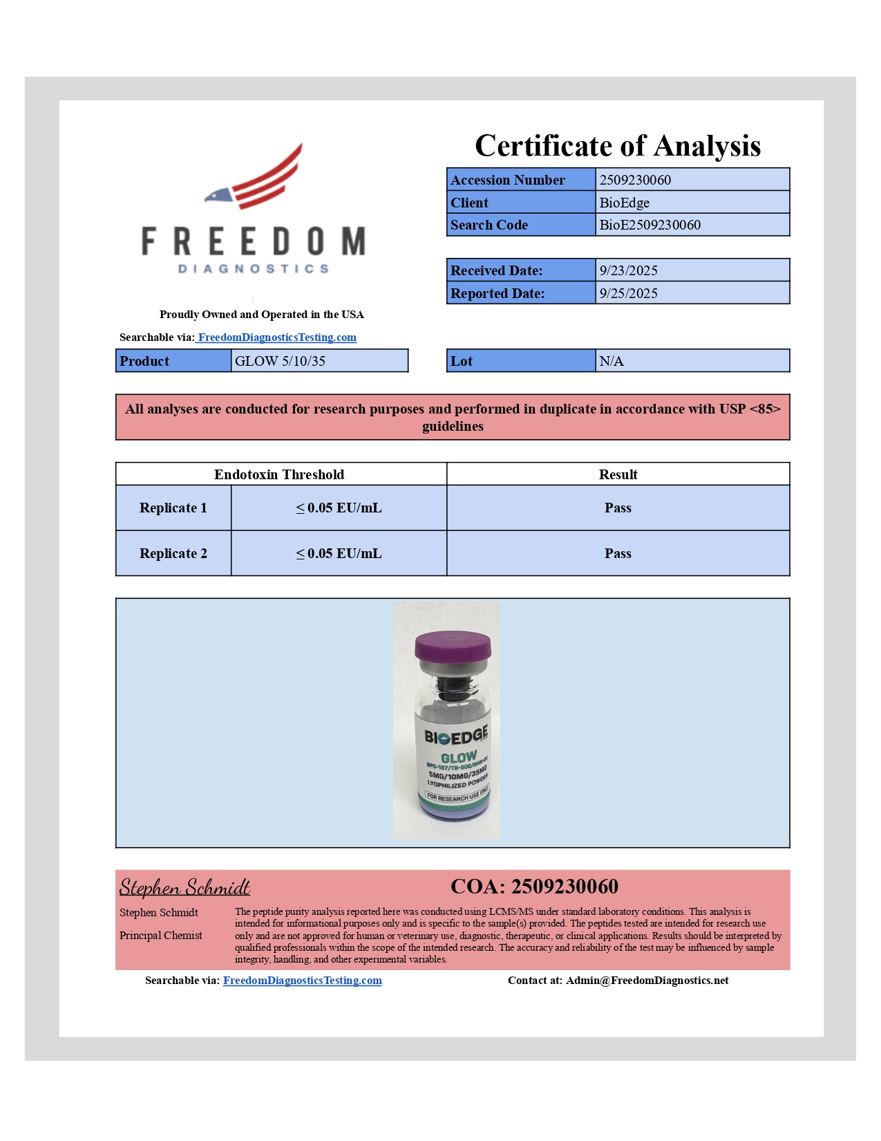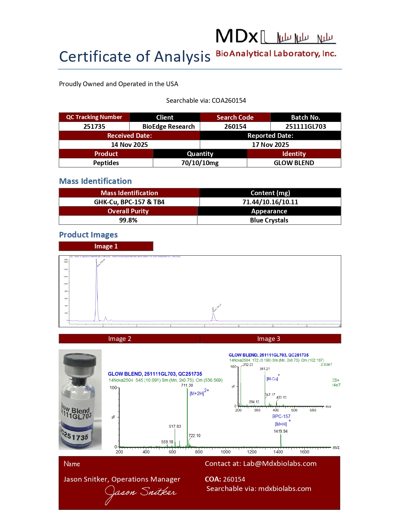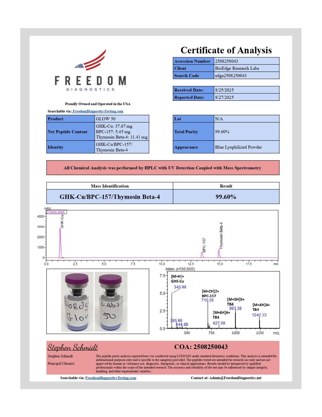 Every batch of BioEdge GLOW (BPC-157 + TB-500 + GHK-Cu) undergoes independent third-party testing prior to release. Testing is performed by ISO-accredited laboratories with results available on each product page.