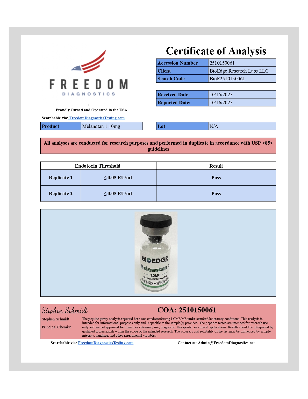 USA lyophilization. Many vendors import pre-filled vials from overseas and relabel them. BioEdge sources API and performs lyophilization within the United States, maintaining direct quality control over the final product.