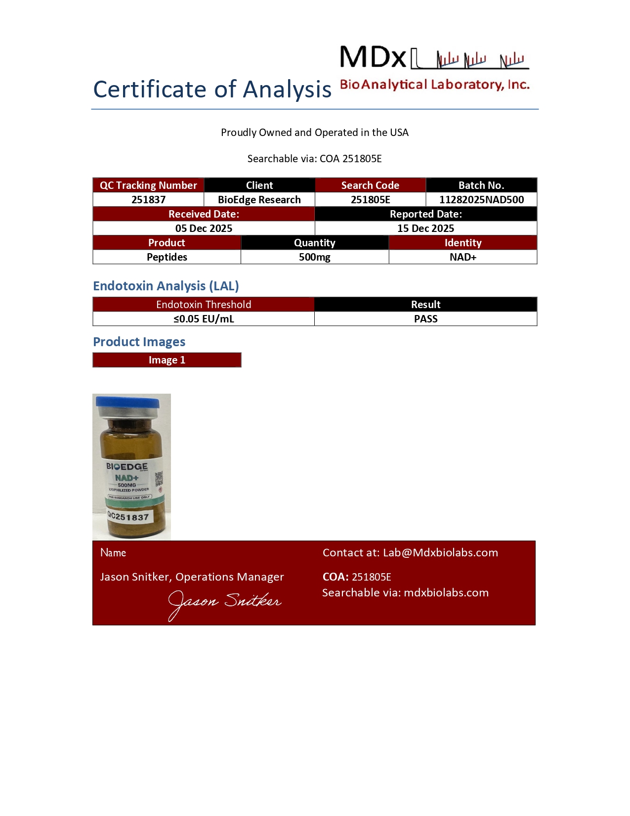Every batch of BioEdge NAD+ undergoes independent third-party testing prior to release. Testing is performed by ISO-accredited laboratories with results available on each product page.